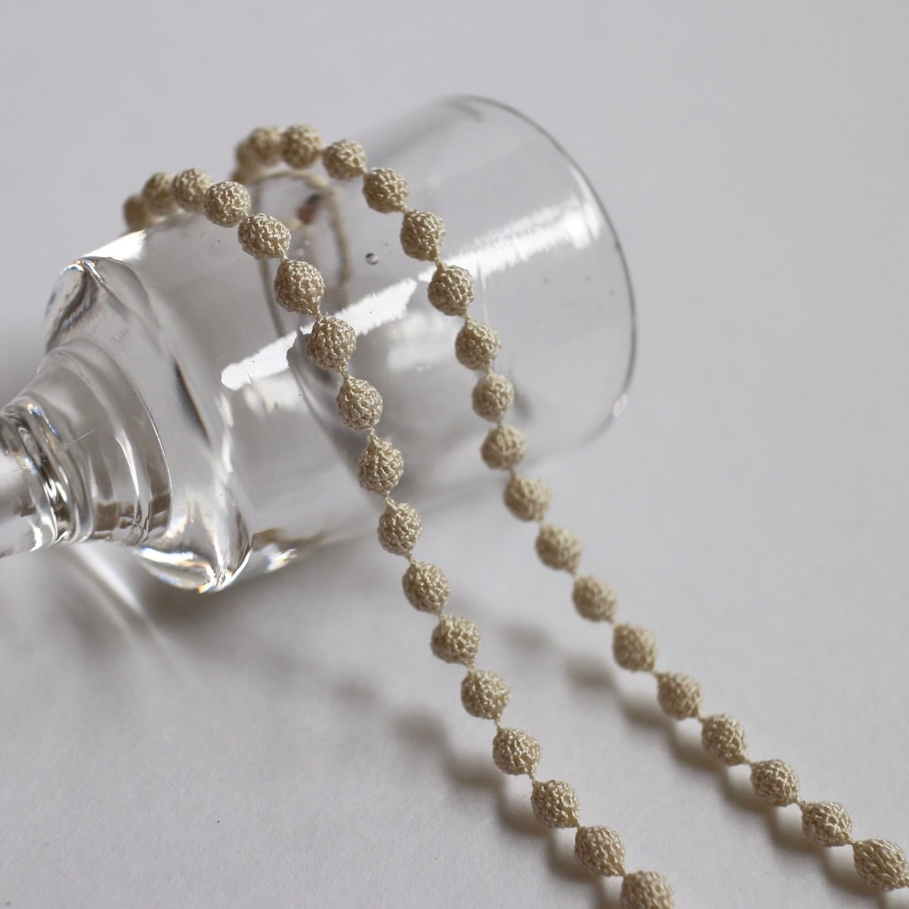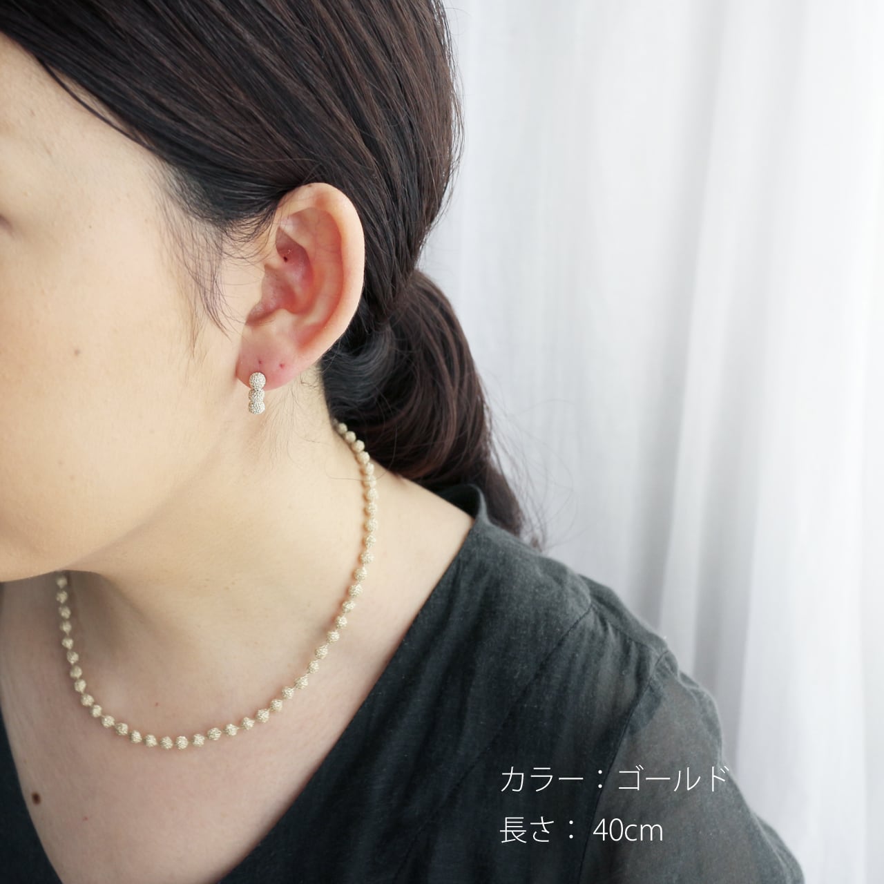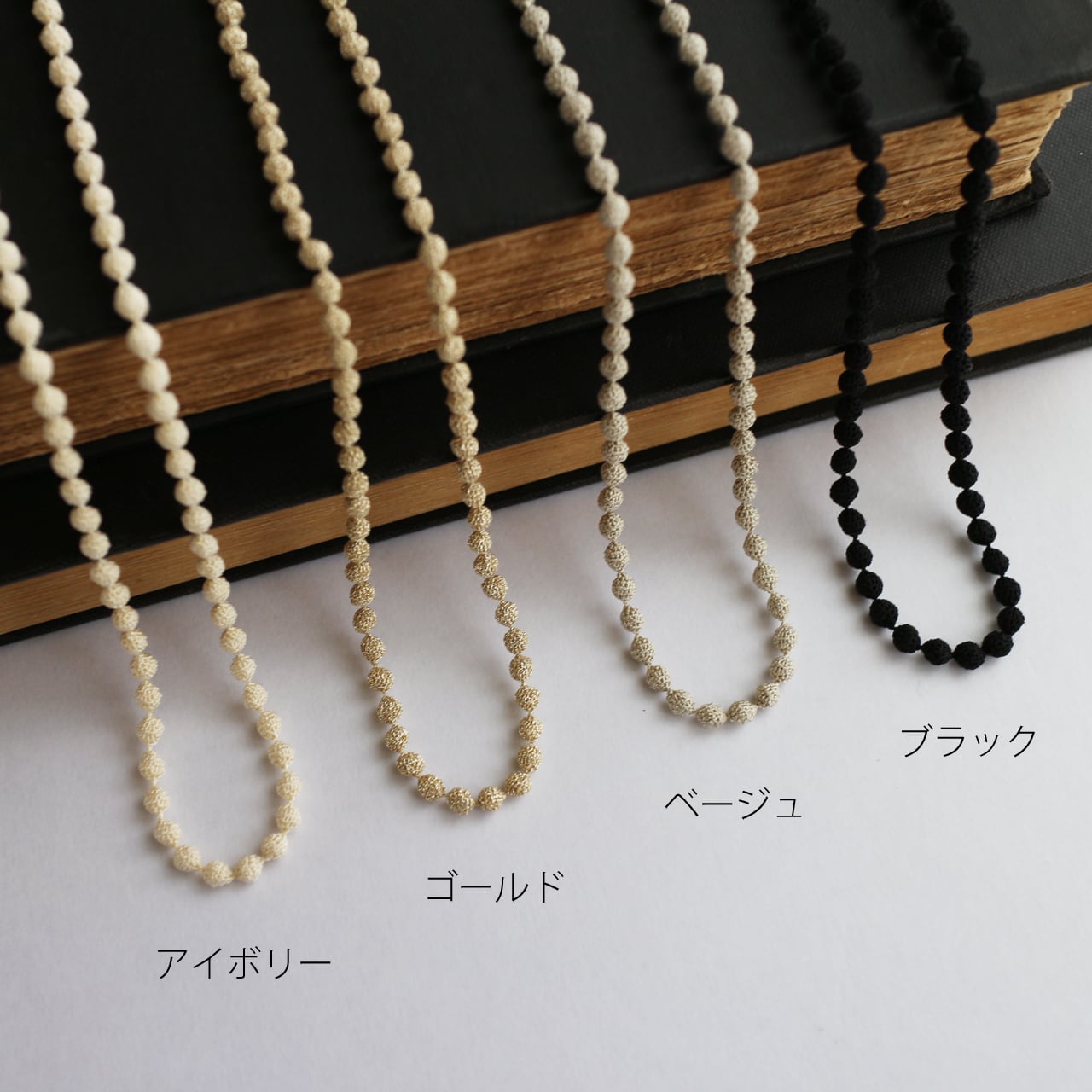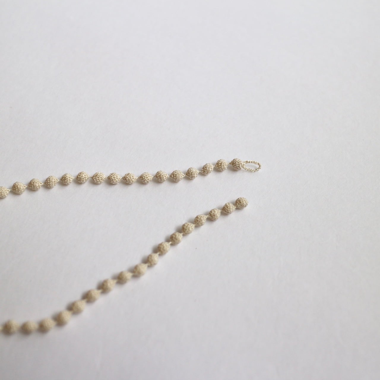 極細のシルク糸で編んだボールのネックレス、粒サイズSS(直径約4mm)。始まりから終わりまで一本の糸で続けて編んでいます。糸ならではの着け心地の良さ、身も心も軽やかにお楽しみください。