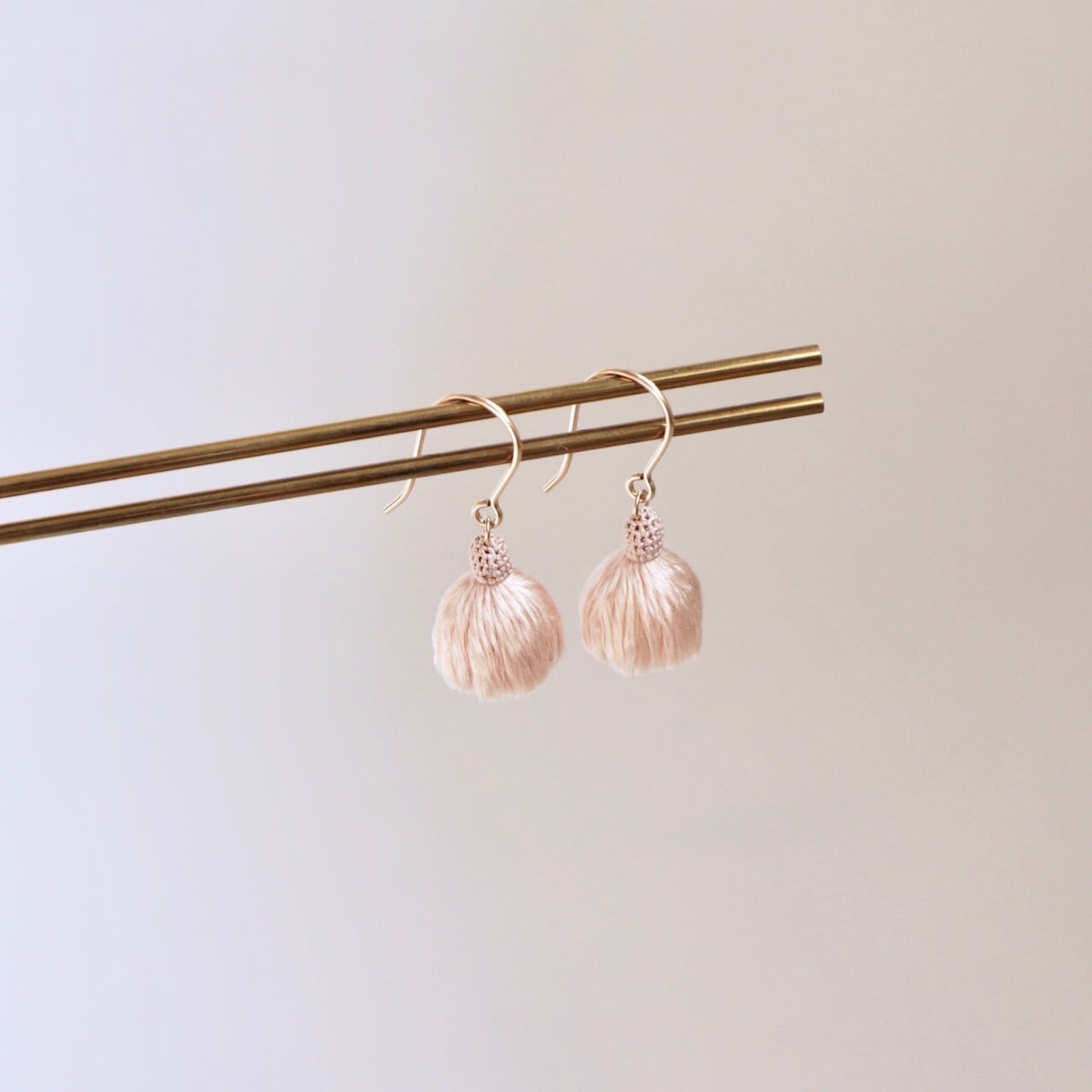 手繰り手染めのシルク糸で仕立てた耳飾り(1ペア)です。