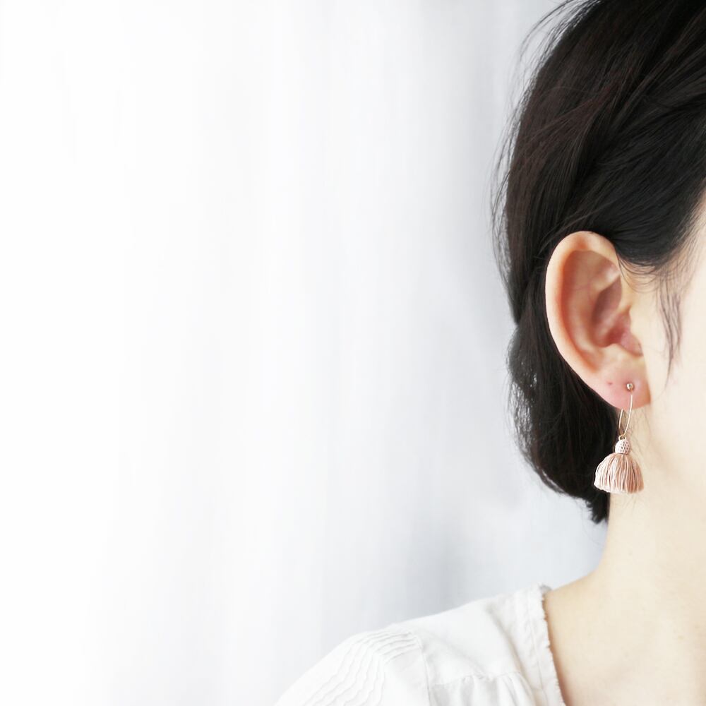手繰り手染めのシルク糸で仕立てた耳飾り(1ペア)です。